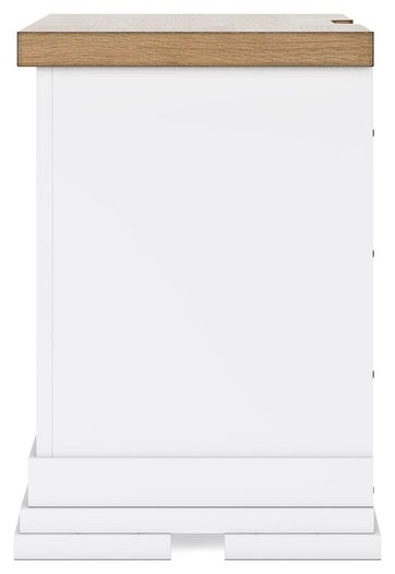Casual style with substance. This two-tone nightstand raises the bar on comfortably cozy design in your soothing sanctuary. A sturdy silhouette with a classic white finish and black metal hardware exudes modern farmhouse vibes. The butcher block oak veneer top adds a relaxed aesthetic. And bedside charging for your go-to devices is made easy with power outlets and USB ports.