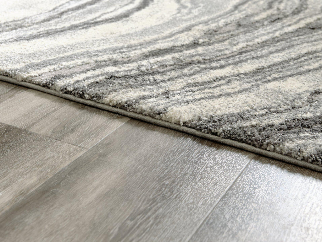 Inspired by gorgeous quartz bands of agate, this area rug displays flowing ribbons of color. Its machine-woven high-low agate design, in ivory and shades of gray, features deep, rich hues while maintaining exceptional durability. Comfortable and sophisticated, this accent rug is the ultimate accessory for your contemporary living space.